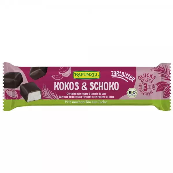 Umplutura de nuca de cocos bio fin in glazura de ciocolata crocanta bio. Combinatia de ciocolata neagra usor amaruie si prospetimea exotice de nuca de cocos este un tratament, nu numai pentru iubitorii de nuca de cocos.