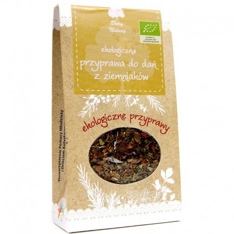 Un condiment bio pentru preparatele din cartofi, amestec de mirodenii excelent ca da gust si o arome noi, minunate, felurilor de mancare pe baza de cartofi. Ingrediente: cimbru de gradina*, patrunjel*, usturoi salbatic*, rozmarin*, cimbru de camp*, marar *, menta*, ardei dulce*, ardei iute*, coriandru*. *ingredient certificat ecologic.