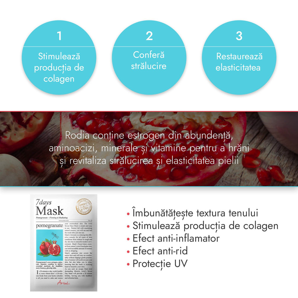 Cel mai popular produs marca Ariul, 7Days Mask, în varianta cu Rodie, conține din abundență estrogen, aminoacizi, minerale și vitamine, pentru a hrăni și a restabili elasticitatea specifică tenului tânăr, având ca efect o piele care radiază. Rodia stimulează producția de colagen și are proprietăți anti-îmbătrânire, antirid și antiinflamatoare. Formula măștii 7Days Mask Rodie este un remediu relaxant dar eficient pentru toate tipurile de probleme ale pielii cauzate de stilul de viață modern. De la roșeață până la lipsa de hidratare. Evadează 20 de minute din cotidian pentru un ten sănătos și reîmprospătat