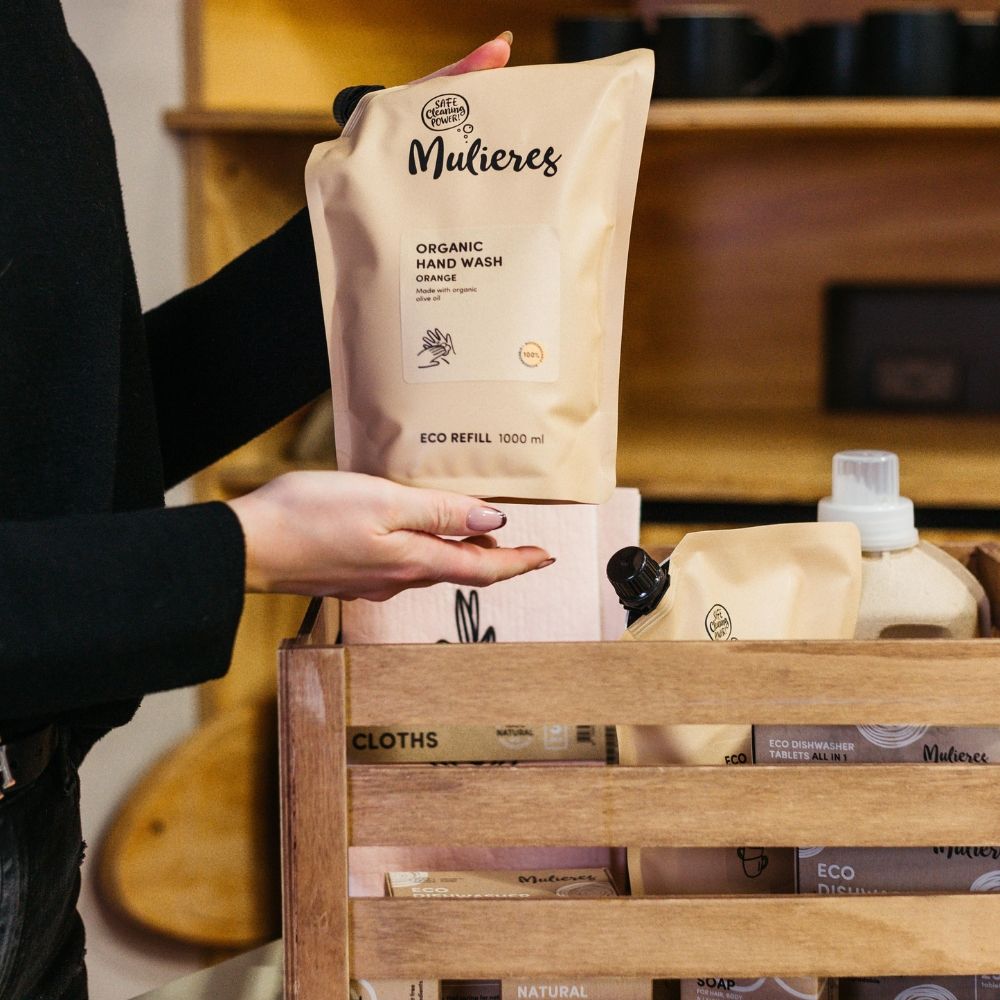 Pachetul de umplere cu săpun de spălat mâini Mulieres de 1 L poate umple o sticlă de sticlă de 4 ori = 520 de utilizări!